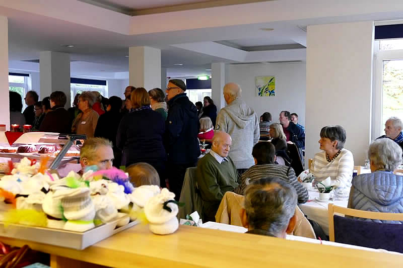 In der Cafeteria, im Foyer und im Cafe Fritzi saßen und standen die Gäste. Gut gelaunt unterhielten sie sich bei selbstgebackenem Kuchen und Waffeln.