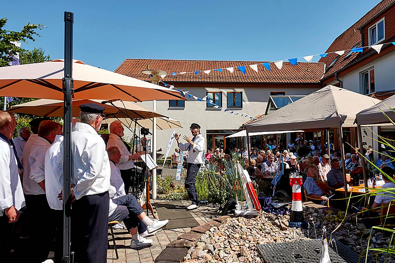 Fischbrötchen, Flensburger, Anglerlatein und Strandkorb zum einen sowie Lieder von Fern- und Heimweh, von der Weite des Meeres und den Seeabenteuern vergangener Zeiten zum anderen - all das gehörte zum Hafenfest am 8.7. in Haus Phöbe.