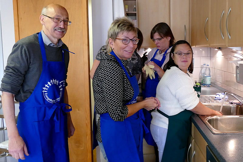 Ökotrophologin Annegret Schiebille bietet gruppenübergreifend kleine Backkurse an. Lebkuchen- und Mürbeteig werden zubereitet, ausgerollt und ausgestochen und nach dem Abbacken mit Zuckerguss und Liebesperlen phantasievoll verziert. Jede Teilnehmerin und jeder Teilnehmer übernimmt einzelne Backschritte, die dem eigenen Können und der persönlichen Freude entsprechen. Allerdings ist immer Voraussetzung, dass die Teilnehmenden Händehygiene und hygienisches Verhalten während des Backens beachten und sich dementsprechend verhalten. Die bräunlichen – besonders gut durchgebackenen - Plätzchen und die Krümel durften schon vorher probiert werden, ansonsten wurde das Gebäck erst am Schluss verteilt.