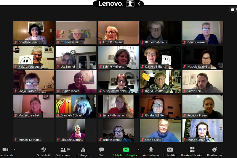 Für die 40 Teilnehmerinnen hieß das: Sie bekamen ein „echtes“ (analoges) Postpaket, trafen sich per Video über Zoom an drei Abenden in einer Woche und nutzten die digitale Bibliothek, Moodle, zum Lesen von Texten, Anschauen von interessanten Filmen und Referaten oder Einüben eines Tanzes. Vieles war in der letzten Novemberwoche möglich: Begegnung, Lachen, Pannen, Kleingruppengespräche, Umfragen, Brainstorming, Diskussion und Bibelarbeiten. Und als am Ende das sogenannte „Desasterfood“-Paket geöffnet und bestaunt wurde und schließlich beim liturgischen Abschluss das grüne Segensbändchen in die Kamera gehalten wurde, so dass sich eine Segenskette ergab - da war Gänsehaut pur angesagt.