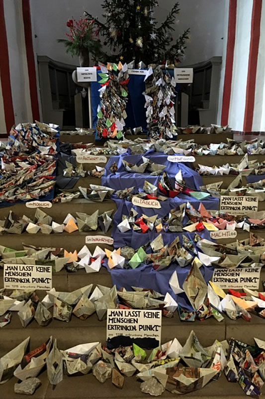 In einer Andacht wurde heute in der Pauluskirche in Werl an die im Mittelmeer Ertrunkenen gedacht. Die Schiffe werden anschließend in der Stadt für alle sichtbar aufgestellt. Es wurde ein Video gedreht und in einem Jugendgottesdienst kommen die gefalteten Schiffe und das Video zum Einsatz.