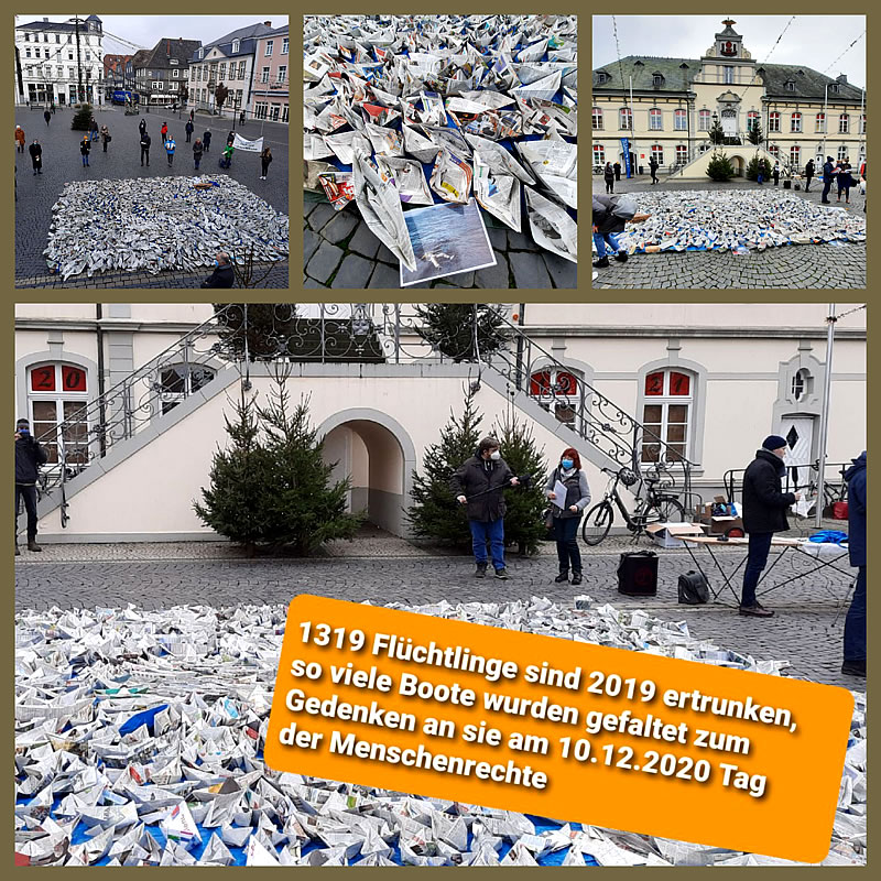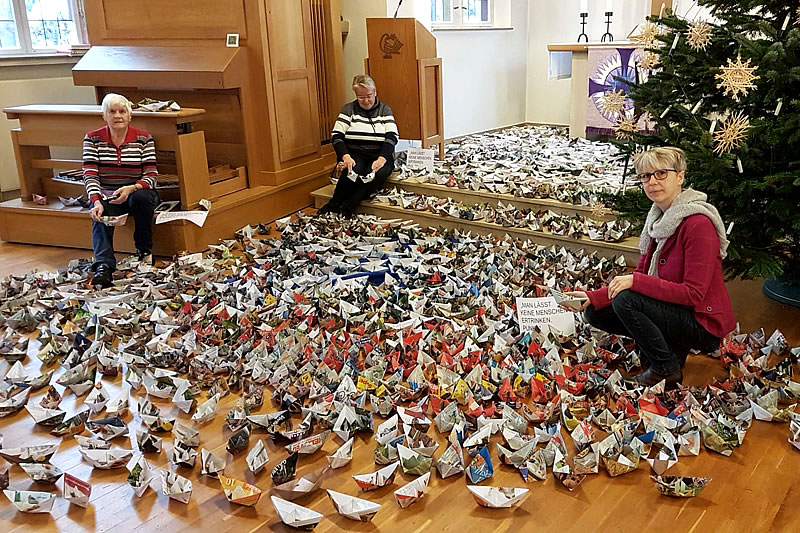 Mit der Aktion „Tausend Boote falten - in Gedenken an die Toten im Mittelmeer“ rief der westfälische Frauenverband auf, aus Zeitungspapier Schiffe zu falten. 1.319 Papierboote sollten es mindestens sein, denn so viele Menschen fanden nach Angaben der UNO-Flüchtlingshilfe 2019 den Tod. Damit soll an unterschiedlichen öffentlichen Orten in Westfalen der Forderung nach einem Ende der Kriminalisierung der zivilen Seenotrettung Ausdruck gegeben werden.