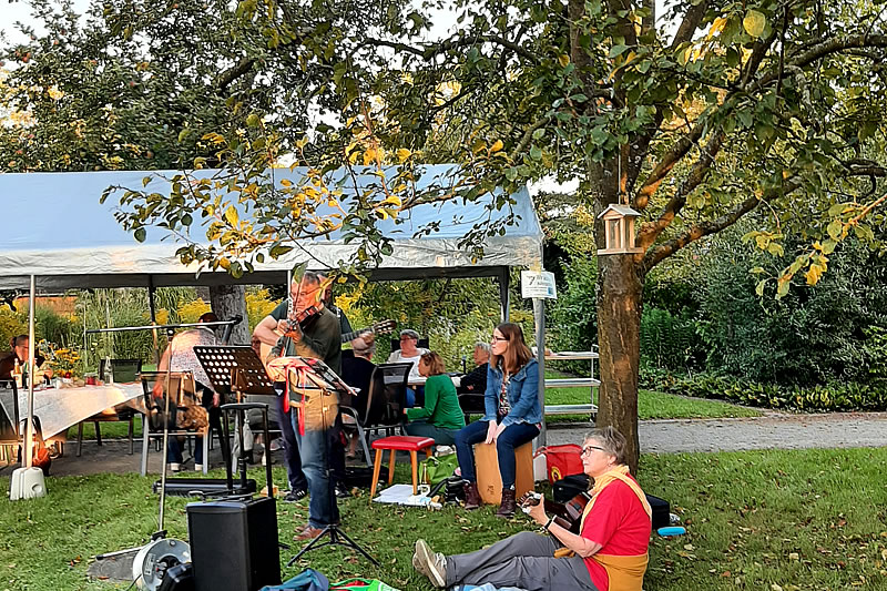 Am ersten Freitag im September von 17 bis ca. 20:30 Uhr gesellten sich etwa 40 Frauen, Männer und Familien ein. Auf bunten Decken oder auf Stühlen ließen sich die teilweise in grün Gekleideten mit ihren mitgebrachten Picknick-Essen nieder. Das Wetter war bestens, so dass der Barfußpfad auf dem Gelände gern und häufig ausprobiert wurde. Birnen, Pflaumen, Mirabellen und Beeren der Obstbäume und -Sträucher versüßten so manch herzhafte Speise. Quittensaft und Fruchtaufstrich aus dem eigenen Biolandbetrieb in Wetter-Wengern konnten am Stand der Westfälischen Frauenhilfe erworben und gleich probiert werden.