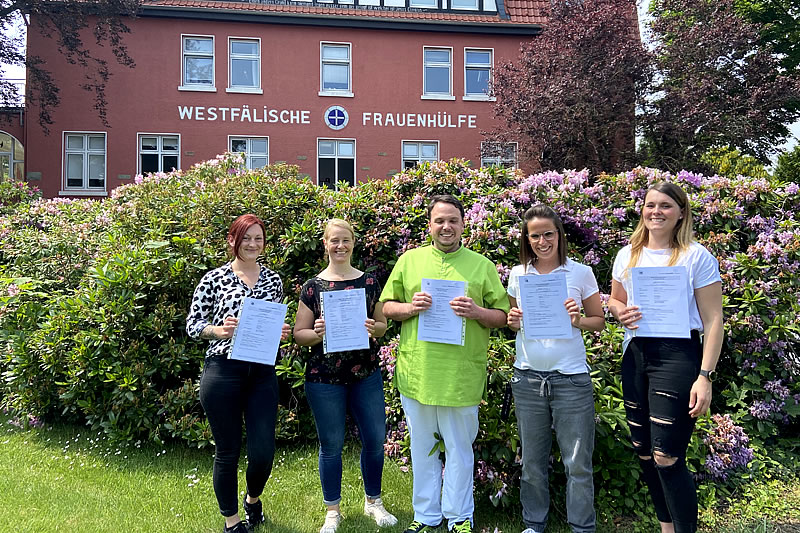 Anna Mariella Will, Melinda Sniehotta-Köhler, Timo Hoffmann, Aleksandra Ziolkowski und Sarah Vorholt (von links) freuen sich über den bestandenen Abschluss zur Praxisanleitung.