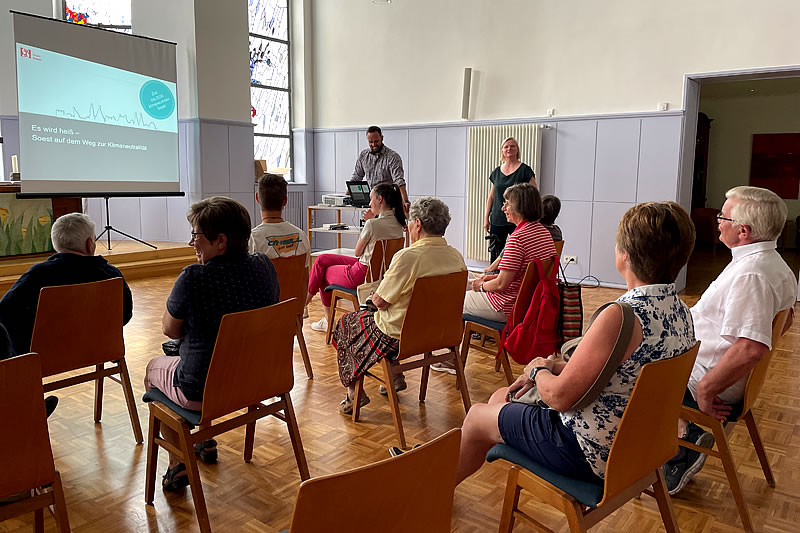 Interessierte hatten sich auf Einladung der beiden Soester Pflegeheime, Hanse-Zentrum und Lina-Oberbäumer-Haus, auf den Weg gemacht in die Tagungsstätte Soest am 22. August. Der Klimabeauftragte Scharschuch hielt einen guten, klar verständlichen und sehr anschaulichen Vortrag. Bei der teilweise hitzigen Diskussion ging er auf alle ihm gestellten Fragen ein und fand Antworten, auch wenn die interessierten Bürgerinnen und Bürger nicht immer mit ihm einer Meinung war. Der Vortrag war Teil der diesjährigen Soester Seniorenwoche.