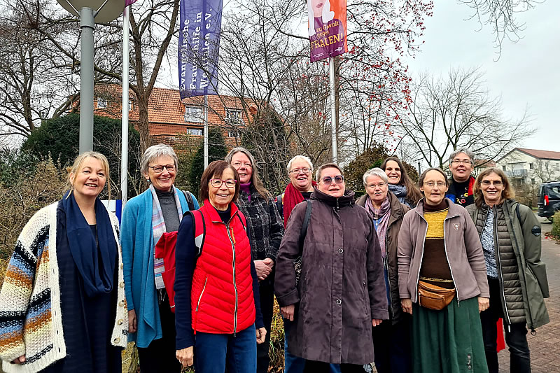 Heike Henrichs-Neuser (Siegen) (v.l.), Superintendentin i.R. Anke Schröder (Bad Oeynhausen), Birgitt Schuh-Johannsen (Bad Lippspringe), Christiana Grimm (Werl), Schatzmeisterin Dagmar Gravert (Dortmund), Dorothe Müller (Schwerte),Vorsitzende Angelika Waldheuer (Münster), Pfarrerin Anne Heckel (Frauenbeauftragte der EKvW), Bettina Willimczik (Porta Westfalica), Leitende Pfarrerin Birgit Reiche (Soest) und Pfarrerin i.R. Petra Buschmann-Simons (Unna) sagen Nein zu Gewalt an Frauen!