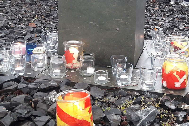 Zum Abschluss entzünden sie Kerzen als Friedens- und Hoffnungslichter.