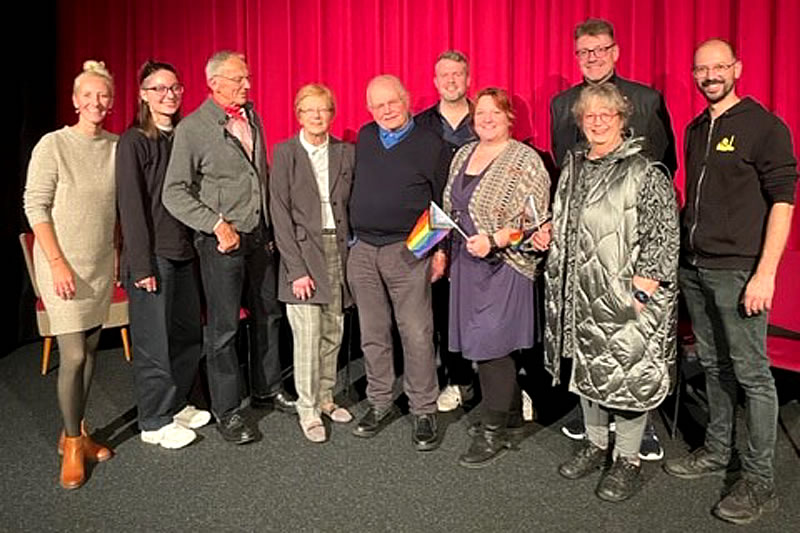 v.l.: Jana Hansjürgen und Charlotte Kaiser von blick*, Toon van Irsel (Protagonist), Christiane Mackensen (1.stellv. Bürgermeisterin), Kurt Schultze (Protagonist), Moritz Leick (Regisseur), Christina Vetter (Evangelische Frauenhilfe in Westfalen), Peter Wapelhorst (1. Beigeordneter), Jutta Maybaum (2. stellv. Bürgermeisterin) und Richard Nüsken (Kino Alter Schlachthof)