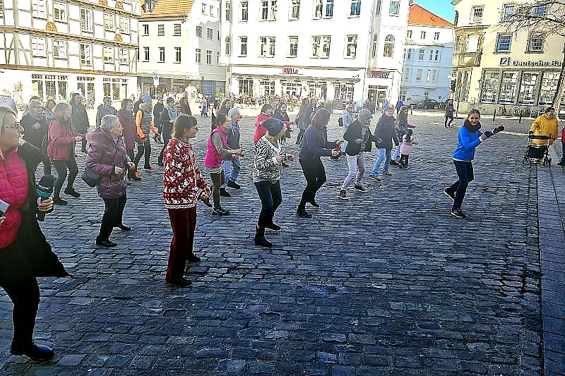 In diesem Jahr widmete man den Tanz-Flachmob insbesondere den Frauen im Iran - mit entsprechender Musik, mit Fahnen und mit dem Slogan „Frau. Leben. Freiheit".