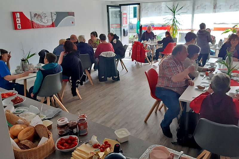 Etwa 30 Gäste kamen Mitte April der Einladung unter dem Motto „Komma rein!“ in Werdohl nach. Mitarbeitende des „Ambulant Betreutes Wohnen Frauenhilfe“, eine Einrichtung der Evangelischen Frauenhilfe in Westfalen, freuten sich mit ihnen über Gespräche und Begegnungen. Frühstücken von 10 Uhr bis 13 Uhr gaben den Rahmen des zwanglosen Beisammenseins.