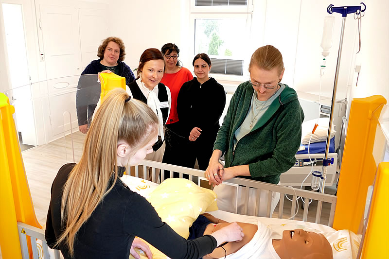 Persönliche Führungen in bestimmten Zeitfenstern machten es möglich, individuell die Fragen rund um die Schule und Ausbildung zu beantworten. Daneben führten Praxisanleiter*innen plus Auszubildende eine kleine Einheit vor, um das Arbeiten mit dem Skills-Lab und den Puppen zu demonstrieren. Selbstgemachte Waffeln, Kuchen und Heiß- und Kaltgetränke sowie Infotische für Gespräche und Informationen rundeten das Angebot ab.