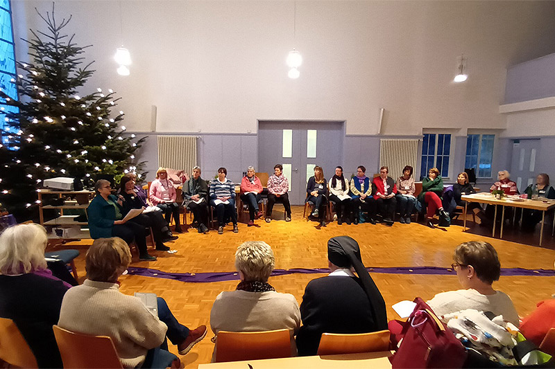 Zu den Fürbitten wurde je eine Kerze auf das lila Band gestellt. „Für mich wurde dadurch deutlich“, so eine Teilnehmerin, „dass das Klagen angesichts der Situation in Nahost wichtig und wertvoll ist. Es gilt nicht, zu beschwichtigen oder Lösungen zu suchen, sondern die Stimmen der Schwestern ernst zu nehmen, für sie zu beten, Projekte zu unterstützen… Und dabei doppelte Solidarität zu üben: mit Israel, mit Palästina. Das ist jetzt unsere Aufgabe.“